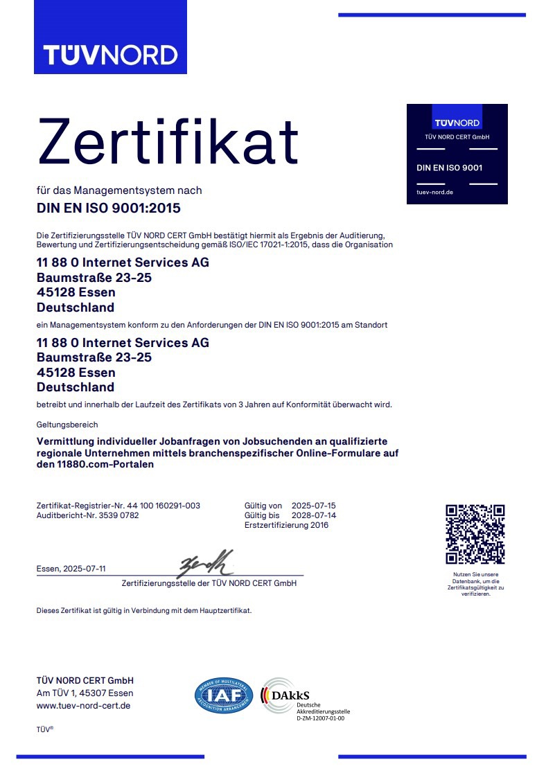 Die Norm DIN EN ISO 9001 ist die weltweit führende Norm für Qualitätsmanagementsysteme. Sie definiert die Anforderungen an Organisationen, um ihre Produkte und Dienstleistungen nach aktuellen Standards im Sinne der Kundenzufriedenheit und eines permanenten Verbesserungsprozesses anbieten zu können.